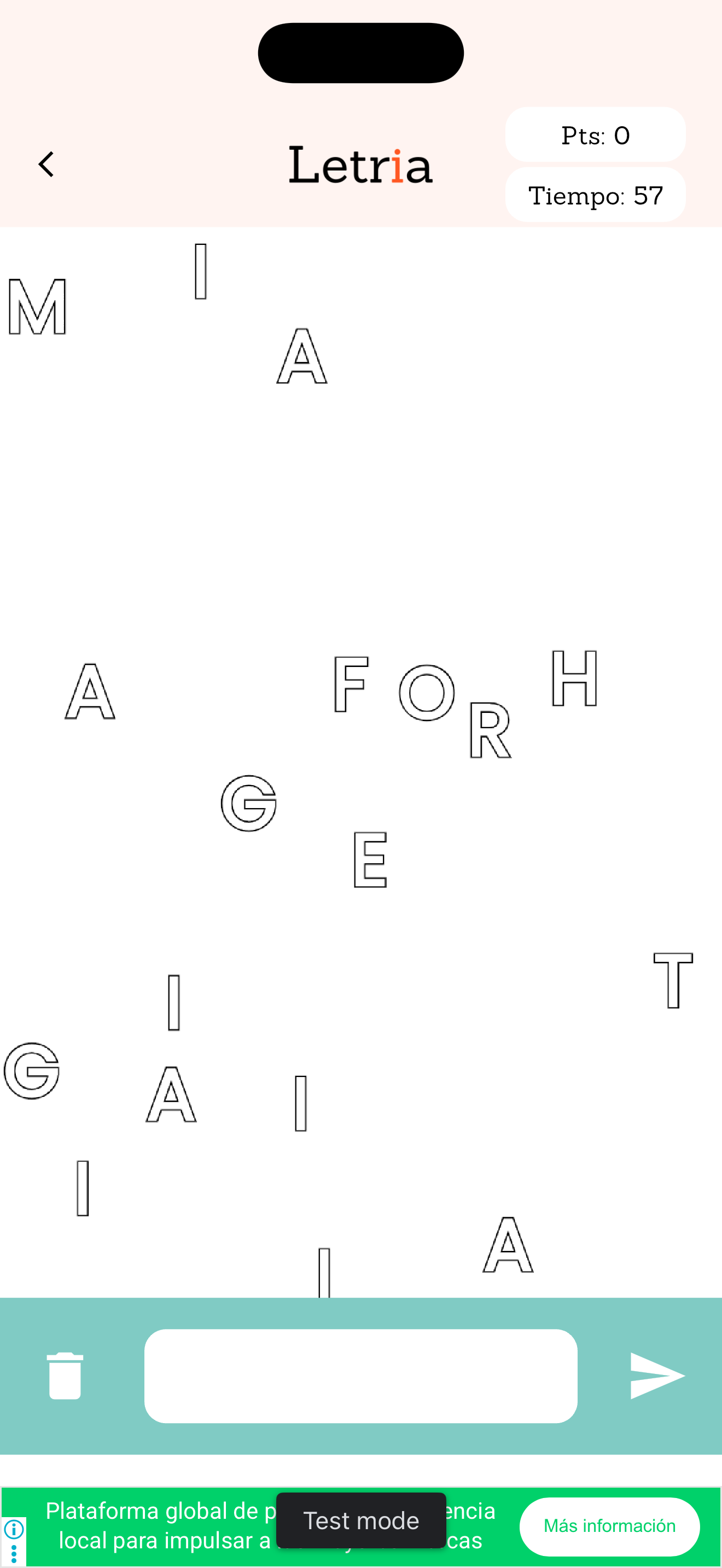 Juego 2D casual y offline: letras caen, formas palabras, ganas puntos. Partidas de 3 minutos diseñadas para jugar en el camión, en la fila, en un descanso. Tienda interna de tipografías como recompensa.